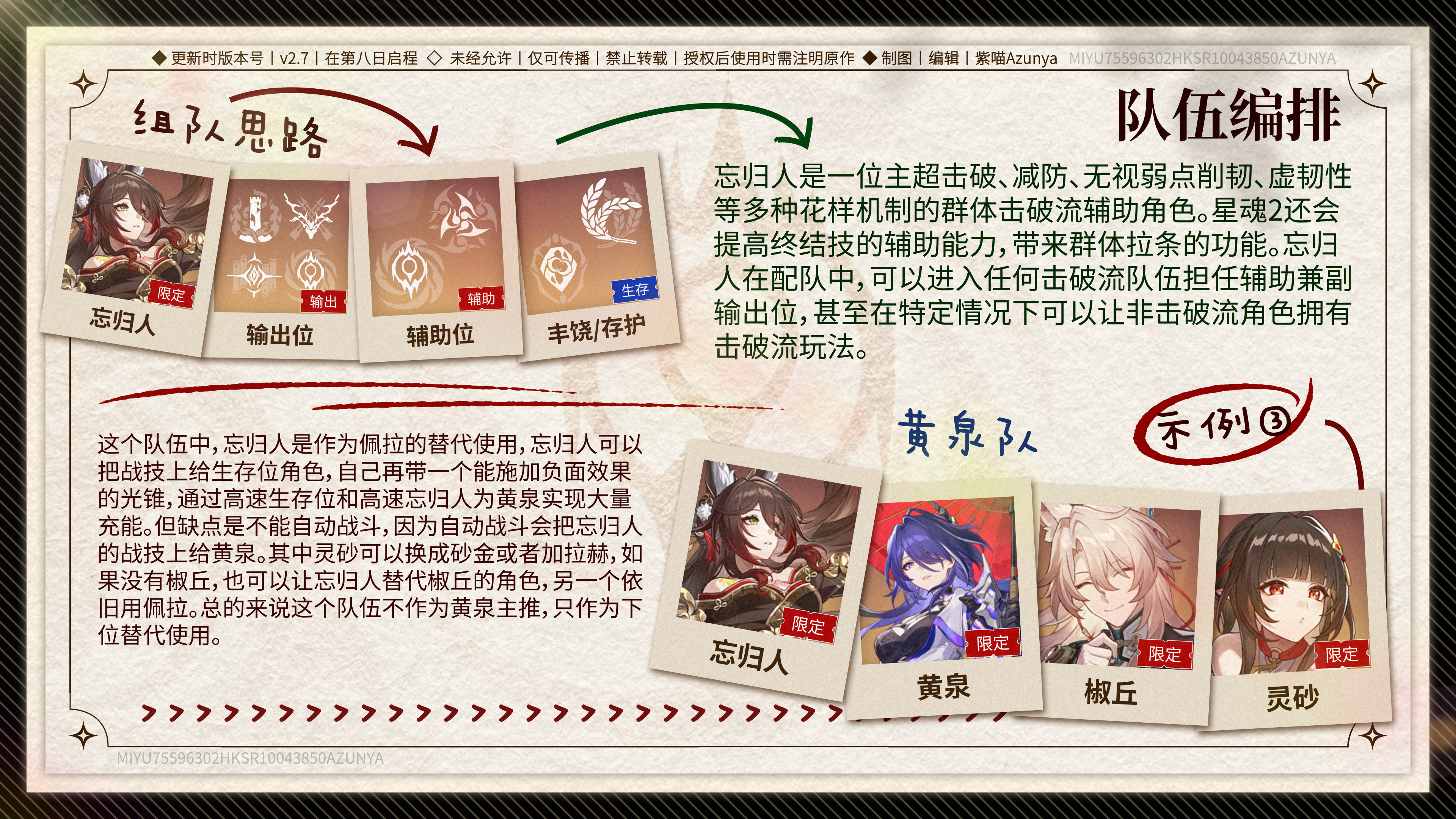 这个队伍中,忘归人是作为佩拉的替代使用,忘归人可以把战技上给生存位角色,自己再带一个能施加负面效果的光锥,通过高速生存位和高速忘归人为黄泉实现大量充能。但缺点是不能自动战斗,因为自动战斗会把忘归人的战技上给黄泉。其中灵砂可以换成砂金或者加拉赫,如果没有椒丘,也可以让忘归人替代椒丘的角色,另一个依旧用佩拉。总的来说这个队伍不作为黄泉主推,只作为下位替代使用。