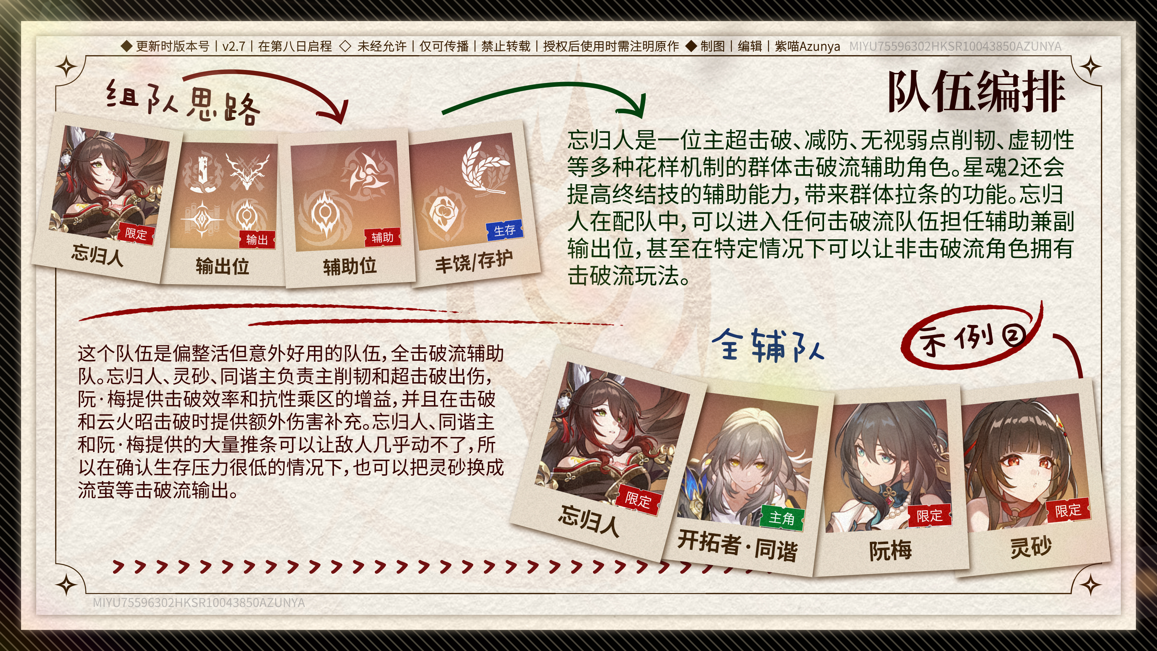 忘归人是一位主超击破、减防、无视弱点削韧、虚韧性等多种花样机制的群体击破流辅助角色。星魂2还会提高终结技的辅助能力,带来群体拉条的功能。