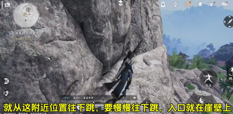 求救声来源,就在前方山崖的下方,就从这附近位置往下跳,要慢慢往下跳,入口就在崖壁上。