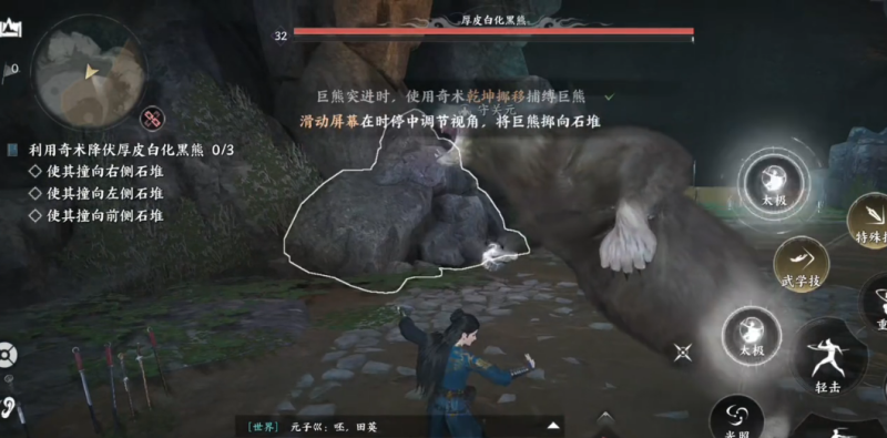 最后打BOSS注意了,攻击对BOSS是无法造成伤害的,造成伤害唯一方式·把BOSS用乾坤挪移分别扔向兰个石堆,要扔哪个石堆,就把BOSS引到石堆前面,【连招】自动打也能击杀BOSS