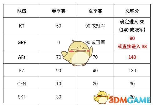 总的来说,现在最稳的就是KT战队,而GRF作为升班马依然拥有主动权,而AFS暂时就要看别人的脸色了。而春季赛冠军KZ战队作为内战幻神,外战送分童子,小编还是私心的想他晋级S8。而SKT和Gen.G,想一串三,一串四简直太难了,不过这两只老牌强队拥有着深厚的底蕴,谁也不能轻视他们!