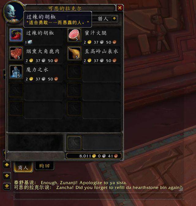 往北来到赞达拉黄金城佐卡罗广场的街道,快出城的位置,这里坐落着一家旅店,老板娘可悲的拉克尔正因为伙计忘记补充炉石而大发雷霆,而正好我们手中有刚刚买来的炉石,用炉石换取老板娘出售的过辣的胡椒。