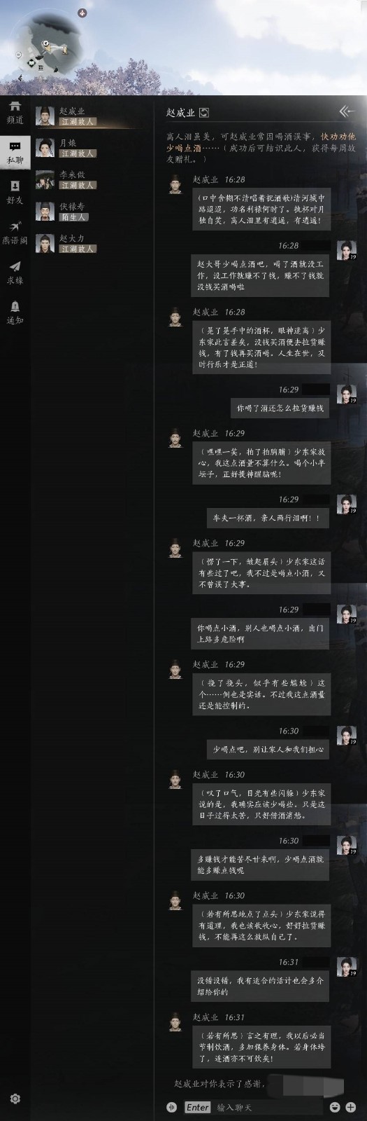 赵威业喜欢喝酒,大致的聊天方向就是劝他少喝酒,可以从赚钱工作、身体和家人几个方面入手。
