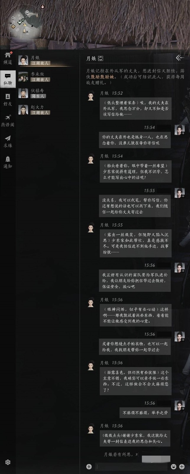 月娘想给在外从军的丈夫寄信,但又胆怯,需要玩家的鼓励。