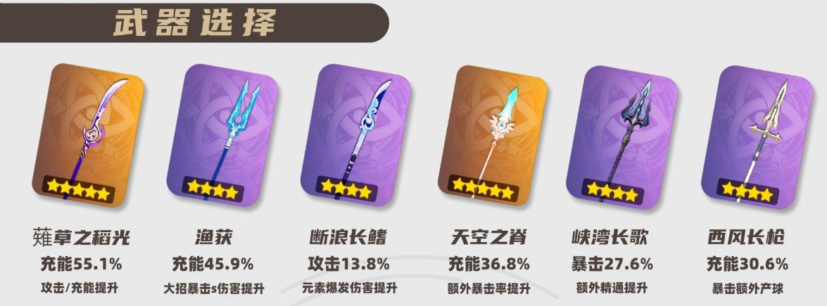 优选「渔获」、「西风长枪」、「天空之脊」等充能类武器,暴击率可以选择在60%(搭配渔获时可以在50%左右的暴击率),暴击伤害推荐在120%左右。