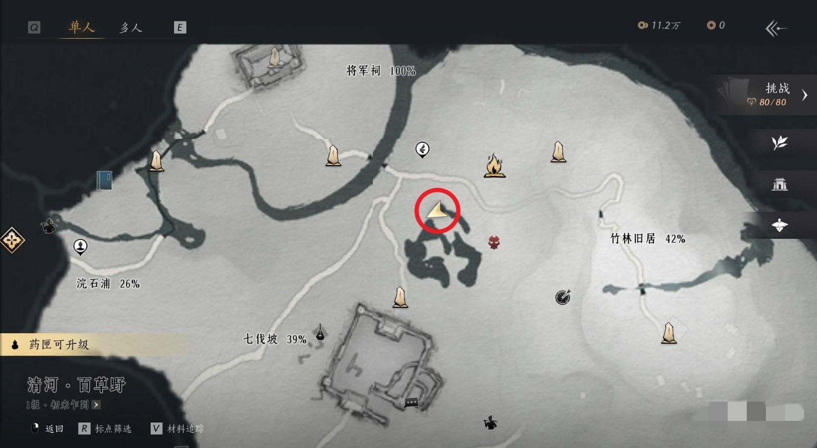 靳春娘的位置在百草野区域的竹林旧居左侧池塘边,参考下图箭头位置。