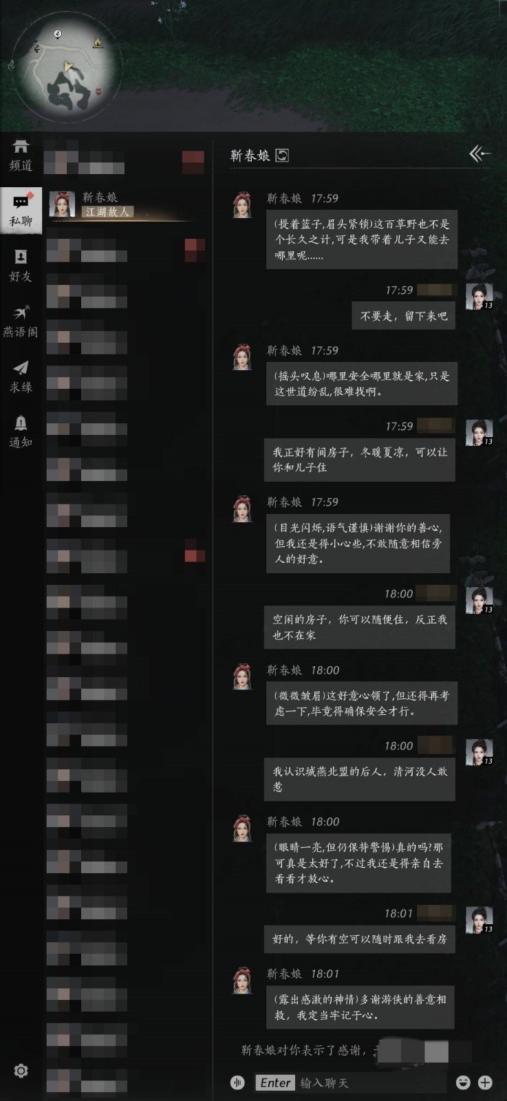 聊天成功后可结识靳春娘,获得每周故友赠礼。