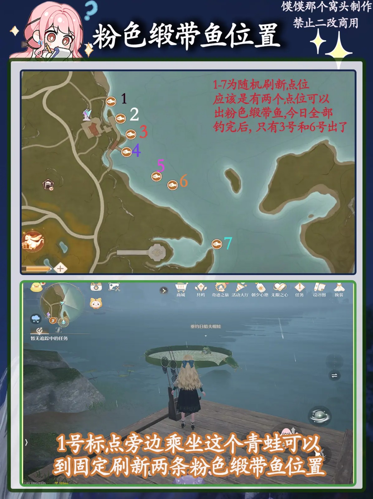 无限暖暖的最新版本开启,上线了很多新活动,今天给大家带来了游戏里面的粉色缎带鱼点位,这是全新的内容,还有小伙伴不清楚在哪里,那么下面就是相关的点位攻略. 无限暖暖粉色缎带鱼点位 每日固定点位P2乘坐青蛙荷叶前往一共两条,青蛙会送到两个位置所以应该还有一条(我一直刷不出来) 其余7个点位应该是随机刷新任意两个点位,两条 每日共5条(我这一直刷不青蛙另一个点位,所以就是四条) 第一次兑换可得100红钻 本文内容来源于互联网,如有侵权请联系删除。