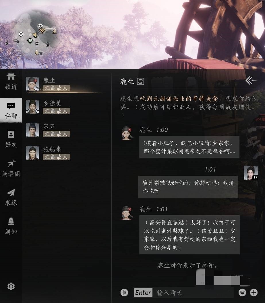 鹿生的需求是要吃元甜甜出售的蜜汁梨球,先聊天说要买给他,然后与元甜甜对话购买蜜汁梨球(无需购买私房菜),元甜甜就在旁边小摊上。