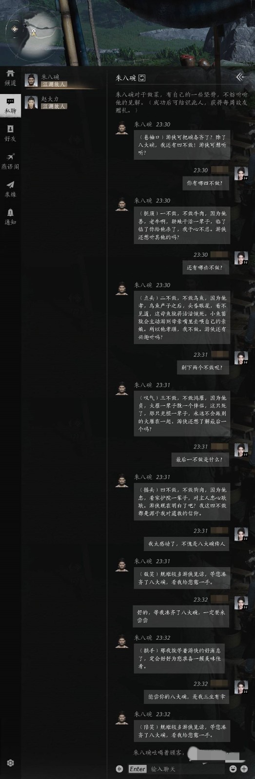 朱八碗的基本思路就是问他有哪四不做,全部说完之后开始猛夸他的八大碗就行,在结束对话前可能会触发重复的回复,不用担心这种重复回复,多夸几次八大碗直到出现结束的提示即可。