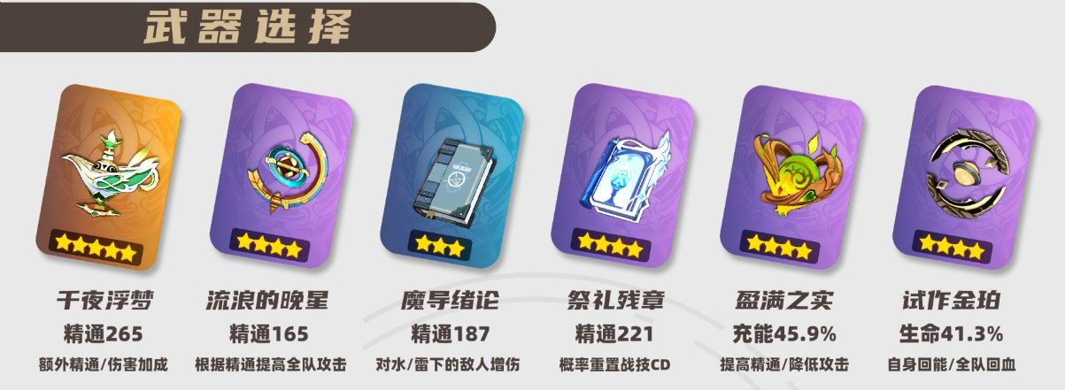 辅助向优先选择精通武器,如「千夜浮梦」、「流浪的晚星」、「祭礼残章」、「魔导绪论」等;输出向可考虑双暴类武器,如「神乐之真意」、「流浪乐章」、「匣里日月」等。