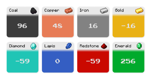 1、矿石分布;这是一个简单的图表,展示了自更新1.18洞穴与山崖地形、群系、建筑高度重塑之后,所有矿石在《我的世界》Y轴坐标下的最佳分布。正如你所看到的那样,煤炭要去96层,挖铜要去48层,铁矿石在16层,金矿石-16层,钻石-59层,红石-59层,青金石0层,绿宝石256层。所以对于喜欢挖钻石的玩家而言,很简单只需要你挖到地底即可疯狂的推图。