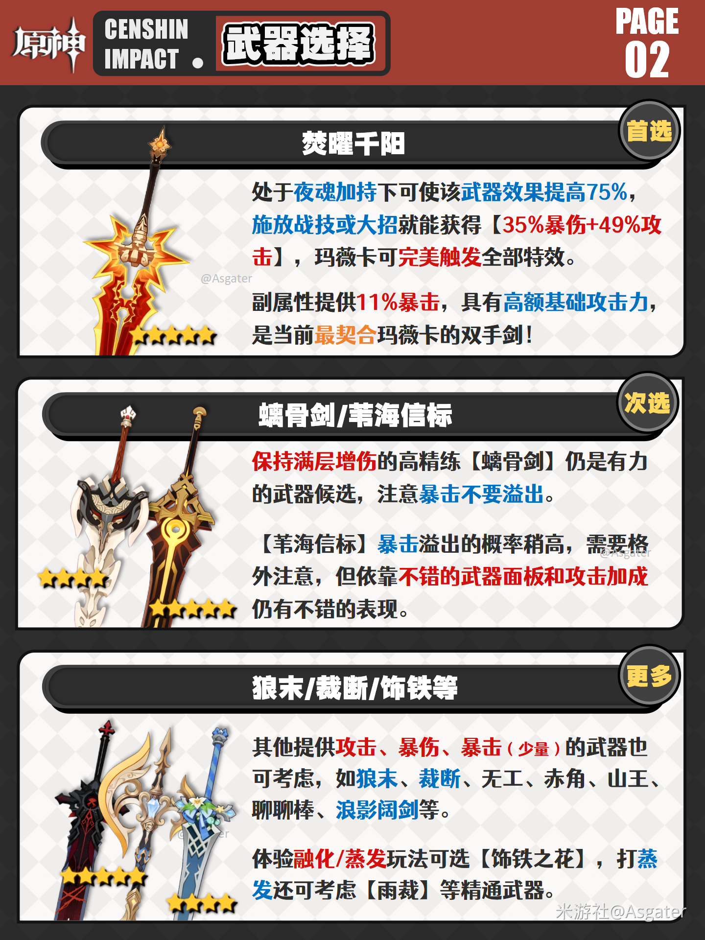 推荐武器选择攻击词条以及双暴词条类的武器,另外当玛薇卡组成反应队伍时也可选择精通词条类武器 ,当选择螭骨剑时需注意携带护盾角色、躲避伤害来维持武器特效。