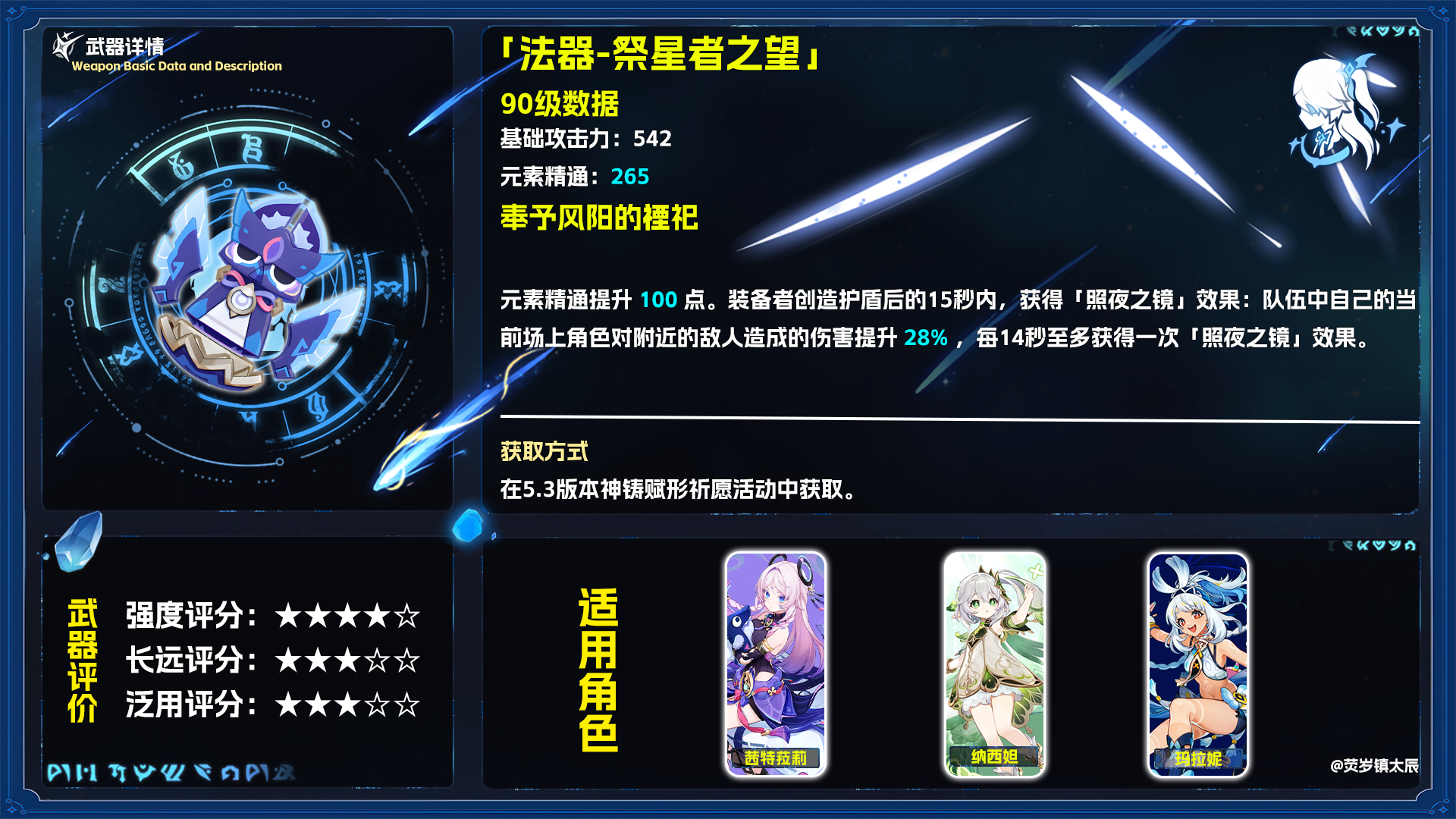 同样的道理,对于纳西妲来说,祭星者之望也是可供选择的武器,因为它能提供365点元素精通,帮助纳西妲更快地达到精通需求。但只有“创造护盾”才能触发增伤的特效非常苛刻,无论是玛拉妮、纳西妲抑或者八重神子,均只能在武器提供的精通方面获得增益,「照夜之镜」的增益效果形同虚设。