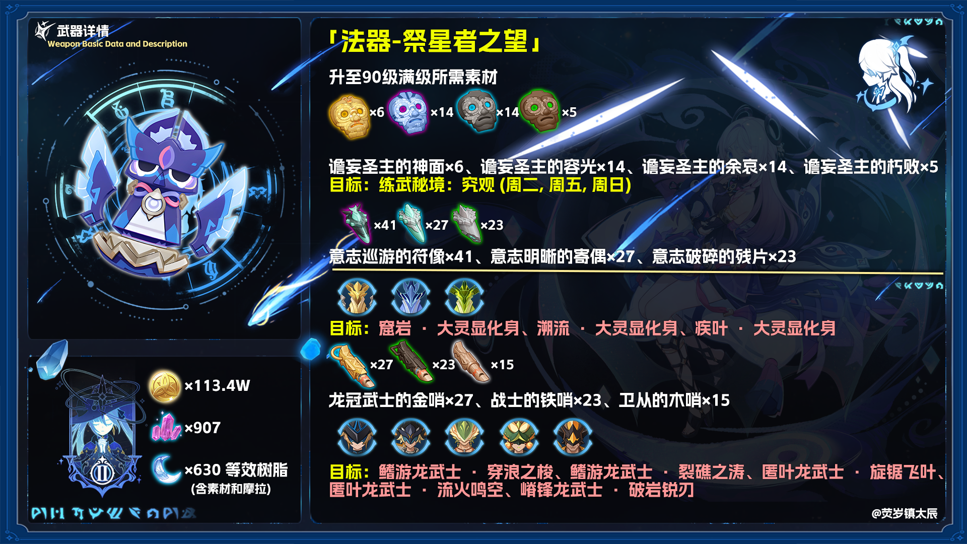 精炼1阶状态下,祭星者之望的副属性给到了元素精通,为265点,特效再次提供100点元素精通,若不看后续特效的生效需求,很难不把它的就业联系到元素反应相关的输出位置上。