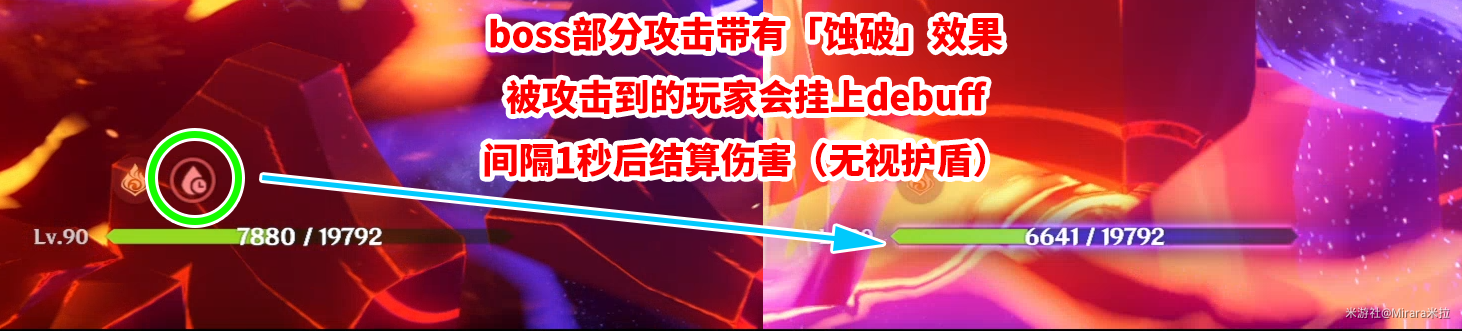 深渊类型攻击还给玩家挂上「蚀破」效果debuff,该debuff生成无视护盾,无视无敌状态