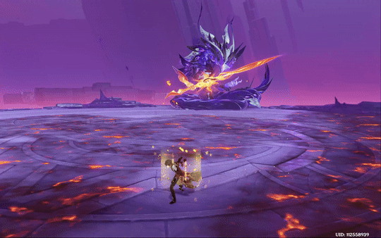 随后boss挥动大剑,砍向地面,造成火元素伤害,并切开平台(此时若玩家处于被切开的平台上,则会掉落)