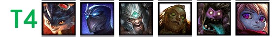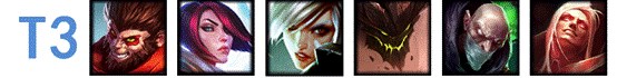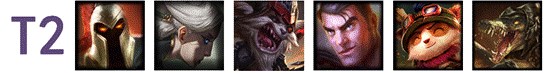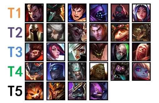 T5级的英雄们基本上对线都非常弱,而且有着各种上位代替品,比如同样是突进团控,猴子能比皇子做的更好,不建议在这个版本用他们冲分,即使是比赛中这些英雄出场也是为了战术设计。