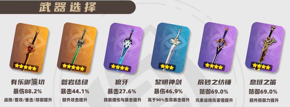 武器可考虑【有乐御簾切】(战技增伤、防御提升)、【磐岩结绿】(高额暴击加成、额外攻击力提升)、【狼牙】(战技/大招伤害和暴击率提升)、【辰砂之纺锤】(战技伤害提升)、【黎明神剑】(需生命值保持在90%以上)等;另外,【裁叶萃光】(高额暴伤加成)、【波乱月白经津】(暴击率加成、元素伤害加成,但更多特效是普攻伤害加成)等依靠较高的面板和属性加成也具有不错的表现。