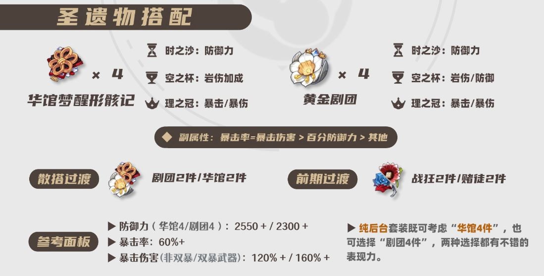 圣遗物套装可在【黄金剧团】4件、【华馆梦醒形骸记】4件中选择其一。