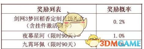 奖励将有机会开出剑网3“梦回稻香”定制月饼礼盒(含挂件激活码卡)以及夜幕星河、九霄环佩、醉挑金盏等限时珍稀挂件!
