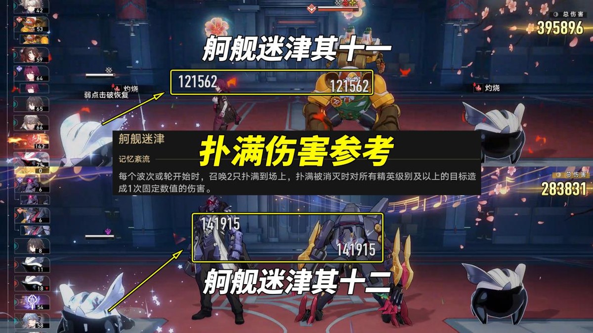 每个波次或轮开始时召唤2个扑满上场(单只血量8万左右),成功消灭将对场上精英与首领敌人造成固定伤害。按照实战结果来看,11层固伤12万、12层固伤14万。并且11、12层大多是双精英或精英首领的组合,消灭扑满的伤害补偿非常可观。