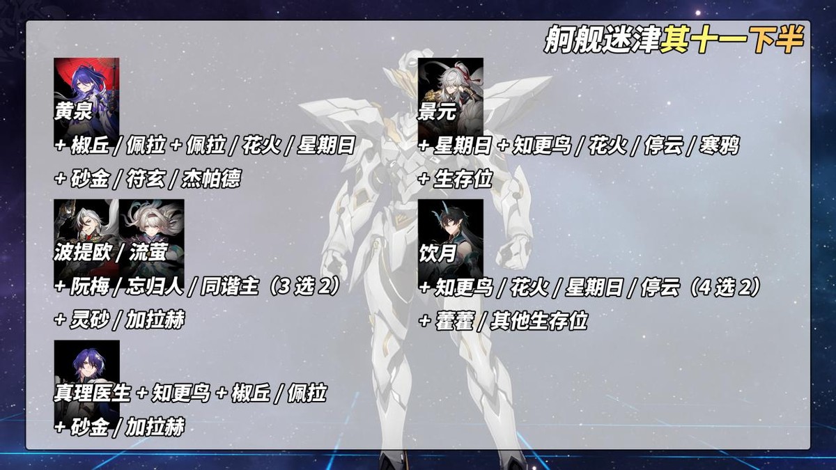 黄泉+椒丘/佩拉/黑天鹅/桑博+佩拉/花火/星期日/卡芙卡+砂金/符玄/杰帕德。